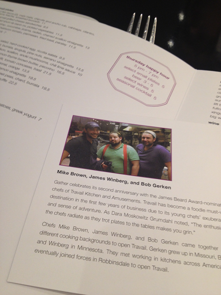 I heard a rumor that in December, Gather will be open Thursday, Friday, and Saturday and will be serving British fare to celebrate the British Ad Awards. I also heard a rumor that the next guest chef has a restaurant near The Walker.