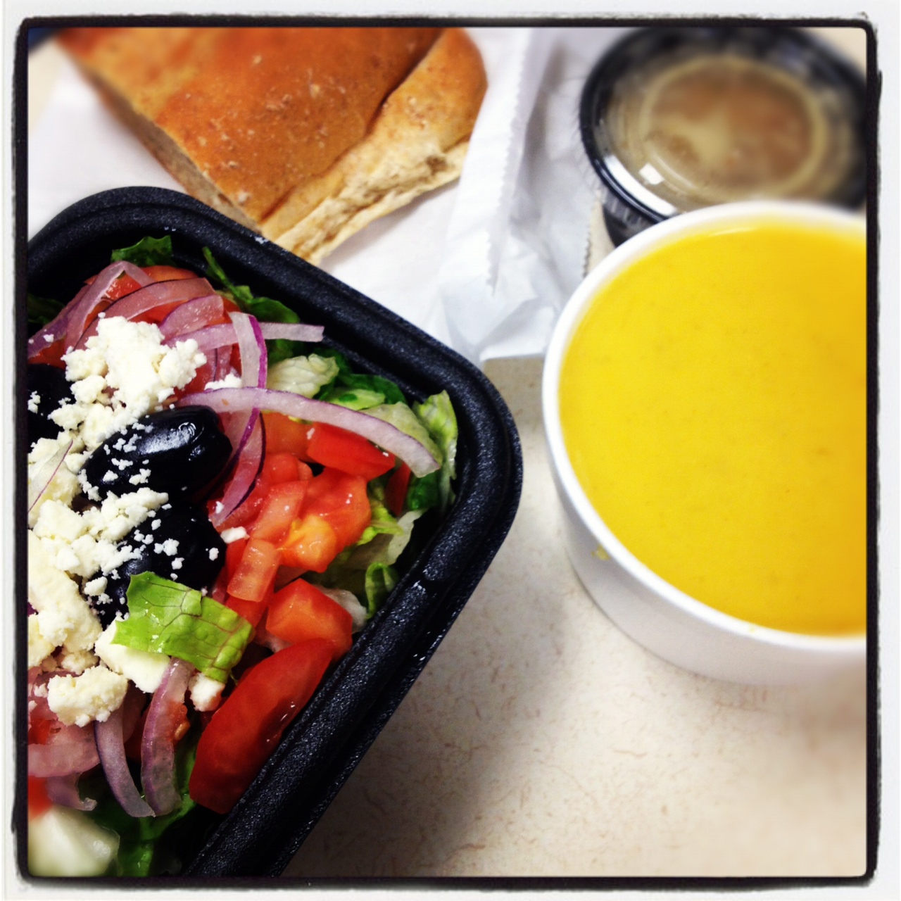 As you can see above, this place offers a meal with color. Red, green, purple, and yellow make for a beautiful lunch. My favorite item on their menu is their small sack which includes a small salad, cup of soup, and bread for under 7 dollars. When you order this lunch you have the choice of over 12 salads and 3 different kinds of soup. If you can, try the curried butternut squash soup. It has a hint of curry and is perfect for a fall day.